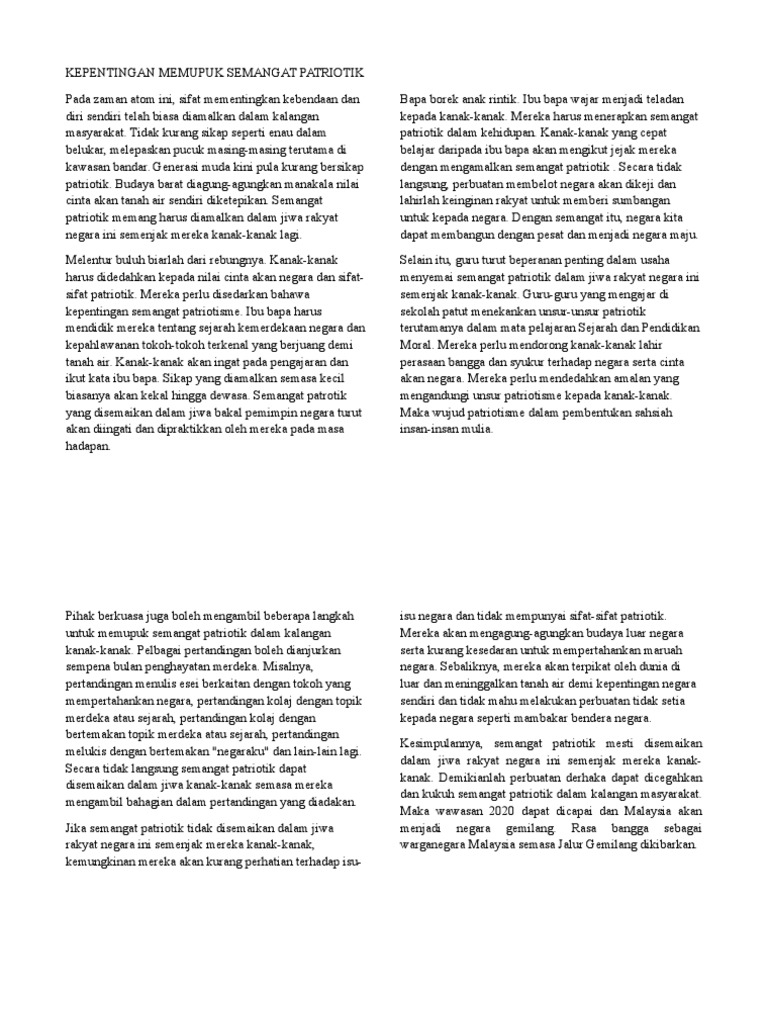 Hal ini dapat memupuk perpaduan yang merupakan elemen penting dalam semangat patriotik, bak kata pepatah, "bersatu kita teguh, bercerai kita roboh". 1 himpunan soalan & jawapan kbat sejarah spm (1249) 2. (p) jelaslah bahawa dalam usaha untuk memupuk amalan budi bahasa, maka tidak boleh tidak, perubahan dalam sistem pendidikan perlu dilaksanakan. May 05, 2020 · antara kepentingan dalam mempelajari sejarah bagi generasi muda adalah memupuk semangat patriotik. Dec 20, 2015 · ini merukan contoh baik untuk memupuk perpaduan masyarakat kerana saling mengambil tanggungjawab menjaga kebersihan kawasan.